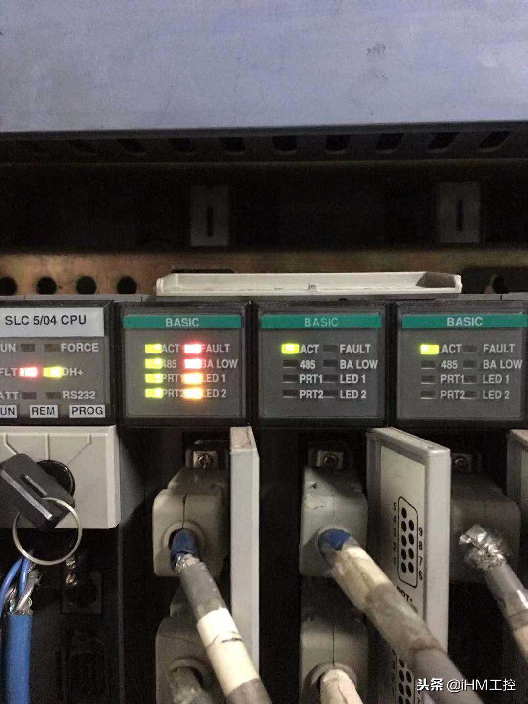 某空压站有一台AB小PLC,SLC5/04,负责整个空压站的数据采集(通过RS485点对点与5台空压机通讯),通过DH+网络与HMI交互(CPU上的蓝色线)。CPU右侧配置有3块485通讯模块BASIC,每块有两个通道。再右侧就是I/O模块了。正常工作时,BASIC上的通道灯(PRT1、PRT2)会定时闪烁,表示在与空压机进行数据交换。