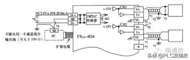 将FX2N-4DA的接地端和可编程控制器MPU的接地端连接在一起