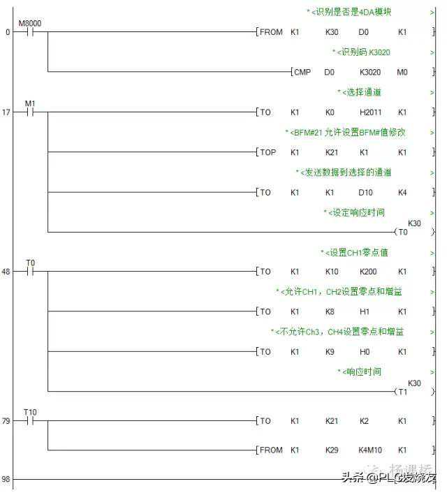 FX2N-4DA和FX2N主单元之间通过缓冲存储器交换数据、FX2N-4DA共有32个缓冲存储器(缓冲存储器为16位,即一个字元件大小)