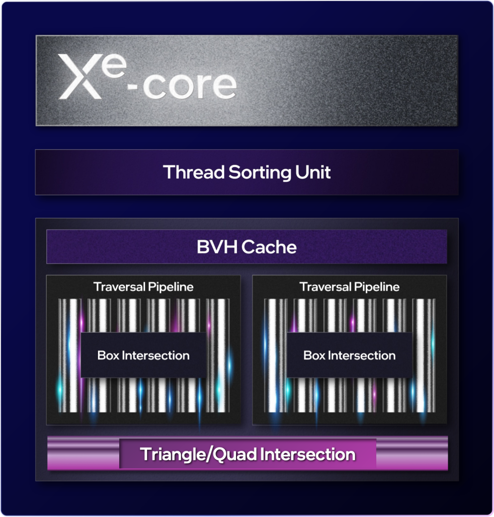 至于锐炫GPU的Xe-core的整体架构,大家可以看Intel提供的下面这张平面图。不同的锐炫GPU在运算单元数量上可能有所不同,但大体结构均是如此。