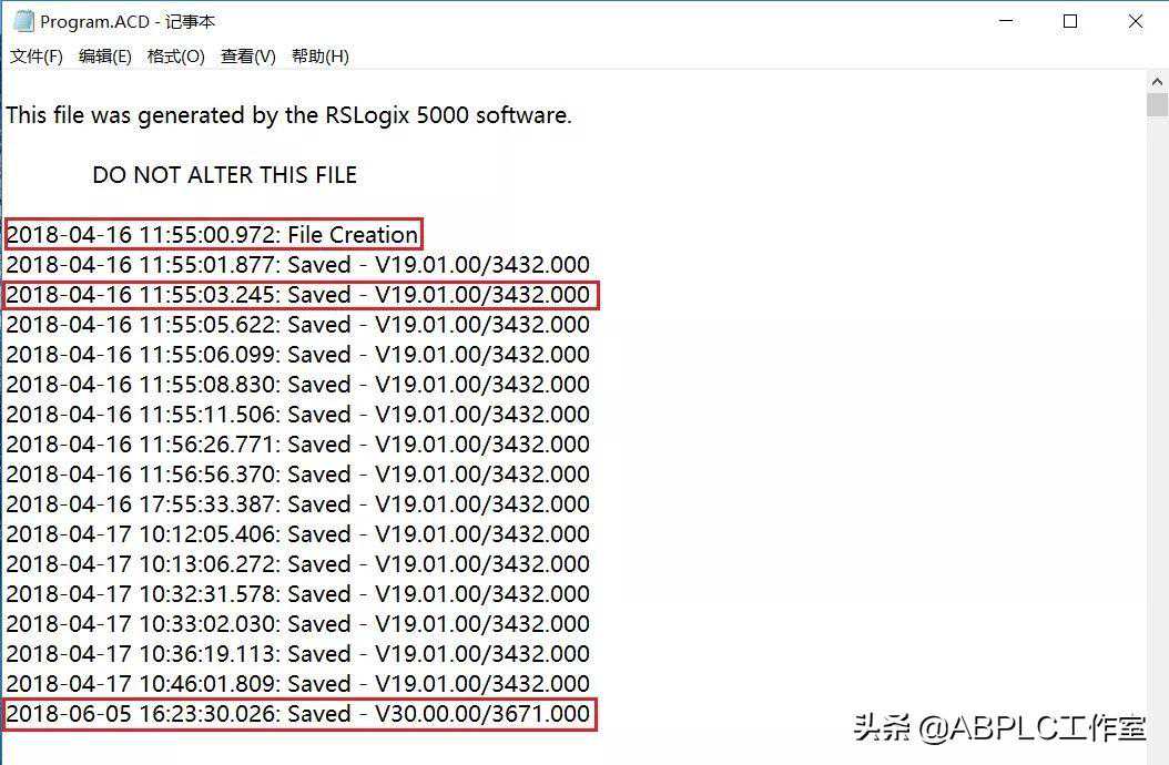 中、大型ABPLC的编程软件从以前的RSLogix5000到目前的Studio5000,都是有版本号的,如、Studio5000V32。高版本的软件能轻松地打开低版本开发的程序,而低版本软件打开高版本程序就不那么容易了。有时从网上下载的例子或同事移交的程序,很多时候都不会标志是哪个版本开发的,这样给我们打开该程序造成一些麻烦,所以,打开程序之前,知道其编程软件是哪个版本就显得非常必要了。本文分享一种轻松识别RSLogix5000或Studio5000程序开发版本号的方法。
