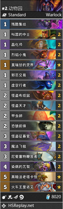 作为古尔丹最后的遮羞布,动物园还是要依靠鞭笞者与染病的兀鹫,甲虫卵和怪盗天才以及跟班与怪盗征募者之间的联动迅速带走对手。值得一提的是新卡塔恒卡可能不再是“它很卡”了,如果前期跟班能够铺起来,在5费准时法老无论是在快攻内战中的随从交换还是防战士法师的aoe实际效果都是很不错的。不管怎么说,简单高效的动物园还是蛮适合在天梯上分的。