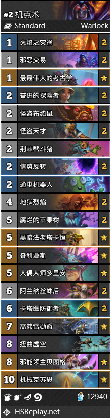 虽然控制向的术士看起来很难拯救,但仍然有一些主播在积极尝试,效果则是不太理想。Dekkster有一套改良版本的机克术,构筑看起来比之前更合理一些,而且外挂了跟班体系比较新颖。卡组还有人偶大师和贝图格,配合情势反转可以打出一些小配合。机克术要兼顾做任务和苟活过牌,导致卡组非常吃牌序,也无法投入更多的解场手段。
