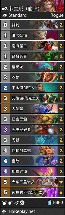 国服玩家SiriusWolf在上周使用了一套宇宙贼,在国服打到了传说78名,这是一个相当不错的成绩了。他的构筑中放弃了任务卡,毕竟对于主打节奏的盗贼而言,开局少了1张手牌十分致命,也无法有效利用免疫刀。宇宙贼目前普遍是以海盗随从作为联动,加强返场和抽卡能力。但宇宙贼的整体强度仍然一般,不太适合作为上分的首选卡组。