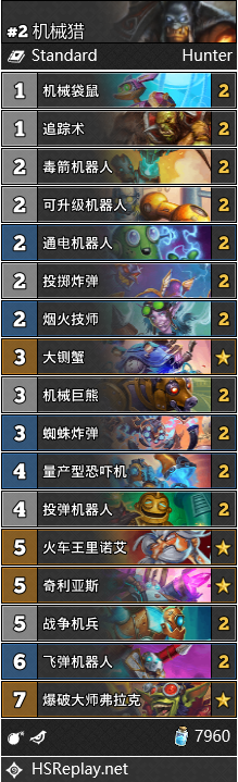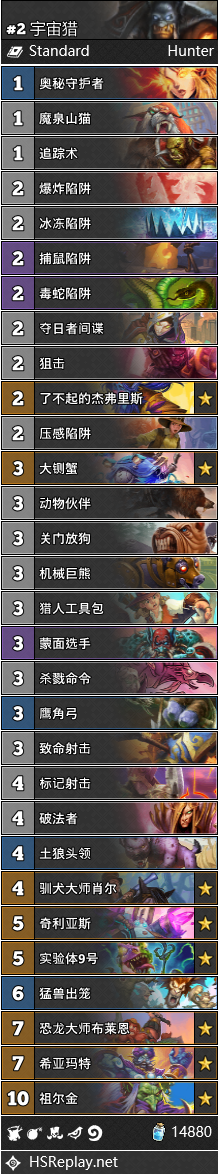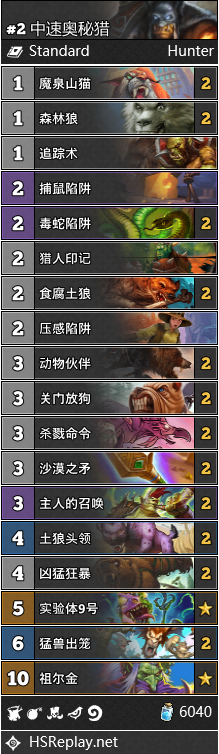 中速猎和奥秘猎同时陷入了困境,合体是个明智的选择,否则都会慢慢消失于这个环境中。中速猎前中期缺少土狼头领这样扎实的场面,也挡不住节奏贼的暴打,奥秘猎都可以补足。这次挑选的是首尔站中瑞士轮17名SevenC(328人参赛)的中速奥秘猎,他大胆的去掉了致命射击和冰冻爆炸这样进攻性很弱的奥秘。这套纯粹进攻的猎人实战效果不错,当然在战法较多的分段还是推荐调整单卡。