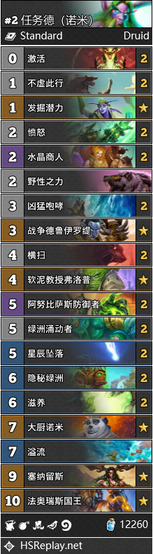 任务德的出场率一再下滑,超生德在国服也近乎绝迹,有些蓝龙德混迹在任务替之中。德鲁伊很难面面俱到,任务德前期让掉的节奏让它很有开局陷入巨大劣势,面对法师的超展开能力又无能为力,如果不带诺米的话连防战也打不过。术士的卡池强度导致构筑已经固化,控制术体系的框架没有得到补强,动物园得到一些新卡的补强后有明显提升,但需要根据环境调整卡位。有外服玩家尝试构筑中速术,充分发挥跟班的潜力,但国服目前还没有看到。