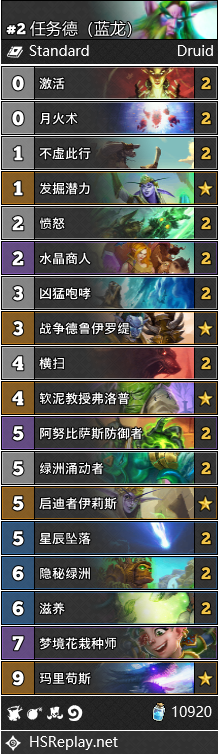 在五-传说分段,有一小撮老练的蓝龙德玩家开始了上分之旅。因为需要744减费,蓝龙德不能像诺米德一样随意的加入大随从。好消息是,如果过牌顺利,游戏中期伊莉斯复制后就能完成斩杀。现在的蓝龙德对于伊莉斯的使用时机需要一些思考,打快攻复制绿洲涌动者、星辰坠落、隐秘绿洲也许都足够取胜。在高分段笔者喜欢带上丛林守护者,4费沉默打2很实用,尤其是面对牧师的圣光守护者。