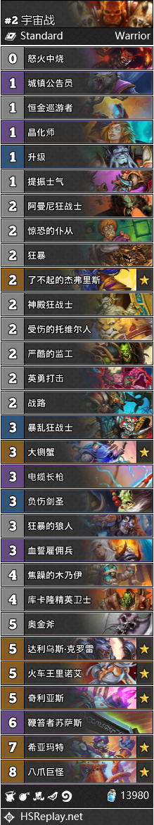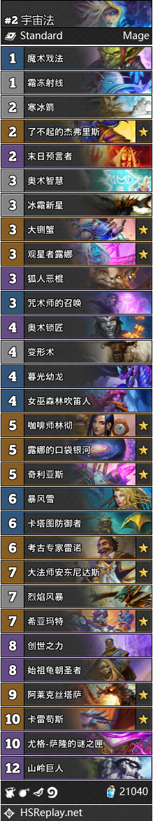 上一期我们在尚不完善的数据中精准地指出了宇宙法的惊人潜力。它目前的实际使用率在天梯和比赛中都达到第一位。它也是最适合用来克制防战的卡组。经过一周的演化,宇宙法宽泛的卡位竞争出了相对更优的选择,比如3费曲线上狐人恶棍战胜了渡鸦信使,4费曲线上暮光幼龙和变羊术开始广泛进入构筑;咖啡师开始增多但仍不算主流,国王也逐渐被舍弃,倒是绝大多数卡组都带了安东尼来提高银河后的后期爆发。实战小TIPS:杰弗里斯这张牌并不一定要用来斩杀或者配合回手打价值,在能够打出节奏、帮你建立优势时就应立即出手。
