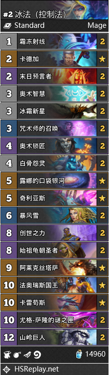 HSReplay没有能对法师卡组进行正确的分类,我们须在此处进行说明。“国王法”包含了奥秘法、携带奥秘体系的冰法,和构筑方式接近于这两套卡组的宇宙法(占大多数),且国王法不一定带国王;“控制法”则包括了大多数不同构筑的冰法(较少),以及构筑与这种冰法接近的宇宙法(较多)。在两种分类里,宇宙法卡组都占多数,且胜率最高。新版本第一个世界级大赛(专家赛制)中,冠亚军携带的套牌均为宇宙法;上海站大师组新征服赛制的比赛中,64名选手提交了56套宇宙法和3套奇迹法。