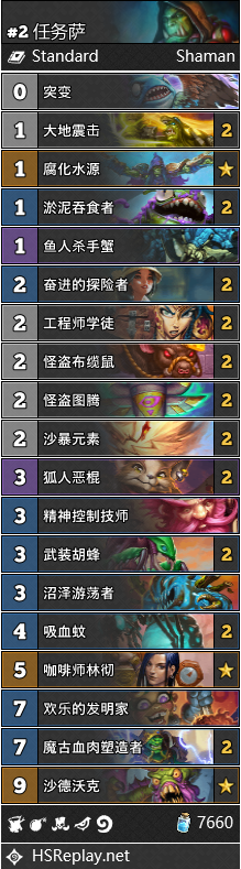 任务萨的版本非常之多且仍在不断演化。除了咖啡师已经成为主流配置外,鱼人杀手蟹和狐人恶棍也越来越多地取代突变体系出现在构筑里。另外,高胜率的构筑和低胜率构筑最大的区别是是否携带了魔古血肉塑造者,尽管它不是一个战吼牌,但它对于这套卡组胜率的提升是显而易见的。相比于过剩的后期能力,任务萨其实更需要一些节奏上的补充。