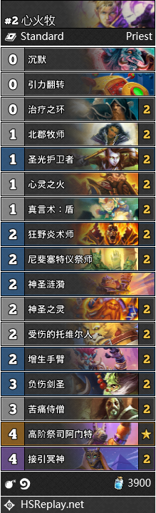 牧师任务的初衷是加强牧师的站场能力,但这个版本牧师最可靠的站场手段,就是1费拍下北郡,2费拍下增生手臂,对面解不掉就GG。因此,牧师固化的思路导致只有心火牧,成为了当前版本唯一的出路。Zetalot使用一套复活牧打到了传说45名,但老玩家都懂的,牧神的卡组不是寻常人能够驾驭,在心火牧没有衰落之前,其他的牧师卡组很难有出场机会。