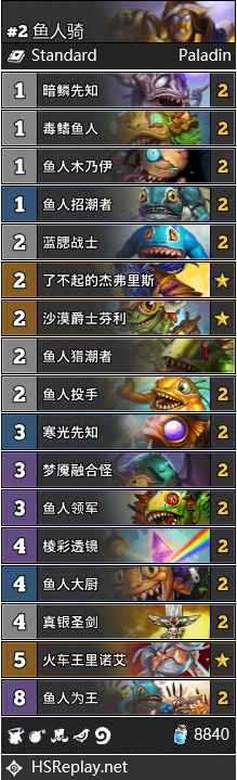在经历过过5费鱼人为王的狂喜和起手双鱼人为王的失落后,玩家们对于莽撞的一波场面不再新鲜,投奔了操作感更好的其他卡组。因为随机性和容易被针对,鱼人骑在比赛中几乎无人问津。随着法师独占鳌头,光头数量减少,换掉诺米带上火车王体检更佳。