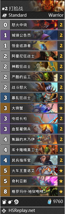 打脸战的崛起和防战脱不了关系。作为同一个职业的两套完全相反的卡组,当防战成为靶子的时候,恰恰就是打脸战最好发挥的时候。针对防战留牌的对手,特别难以抵挡打脸战快速的前期展开和汹涌而来的直伤。血誓雇佣兵这张卡是这套卡组的一个爆点,用好了可以打出对手难以处理的场面或是很高的斩杀。