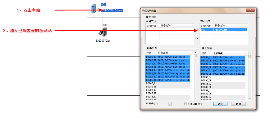 主站配置:双击主站-单击已配置好的从站-单击加入配置好的主站