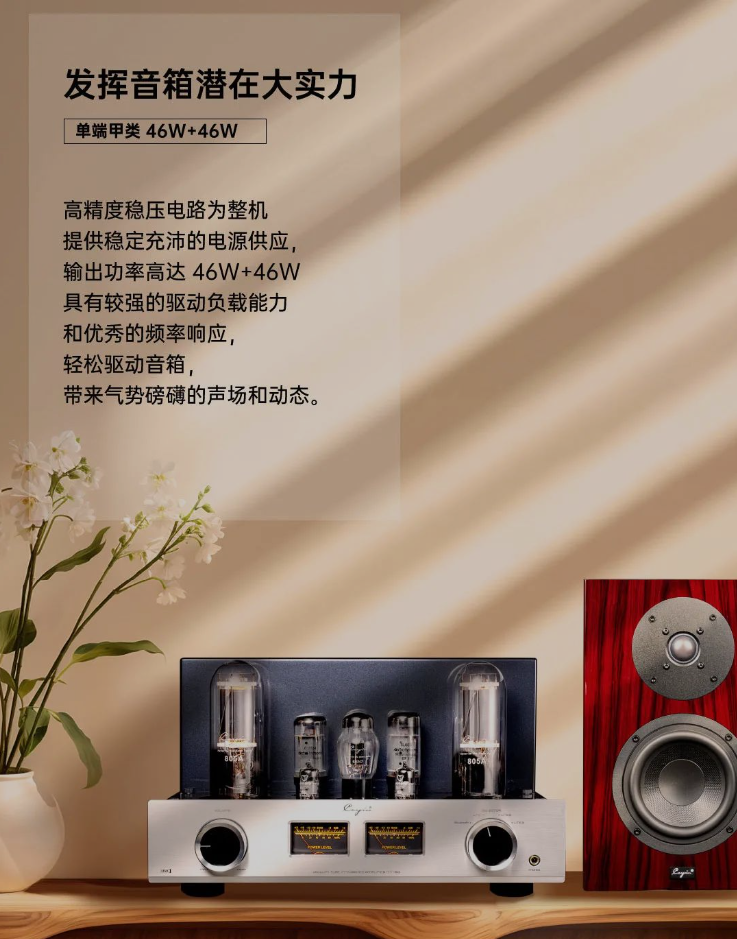 凯音声称,该功放采用“高精度稳压电路为整机”,具有“较强的驱动负载能力和优秀的频率响应”,单端甲类输出功率达46W+46W。