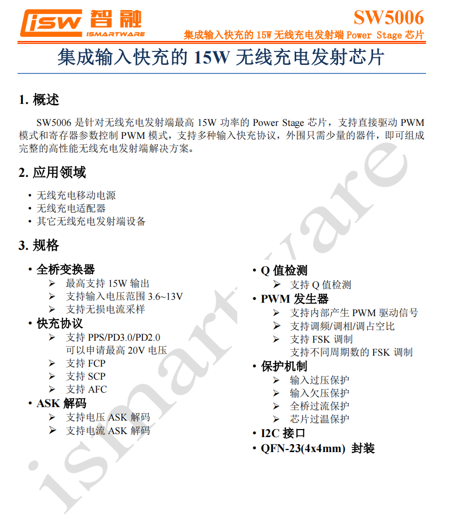 SW5006支持PPS///SCP/AFC等快充协议,支持ASK解码、Q值检测,具有输入过压保护、输入欠压保护、全桥过流保护、芯片过温保护等保护机制,采用QFN-23(4x4m)封装。