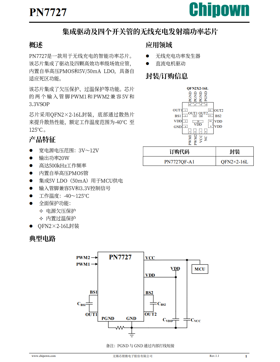 PN7727内部集成电源欠压保护和过热保护,两个PWM输入脚兼容5V和3.3V信号电平,抗干扰性好。PN7727为单晶圆设计,提供QFN2*2-16L封装,QFN封装底部具有散热焊盘,有效降低器件温升,适用于无线充电发射器和直流电机驱动应用,同时其QFN2*2-16L封装在同类封装中具有非常出色的紧凑设计,在同行业中处于领先的水平,可以更有效的散发热量与提高芯片的性能稳定性。