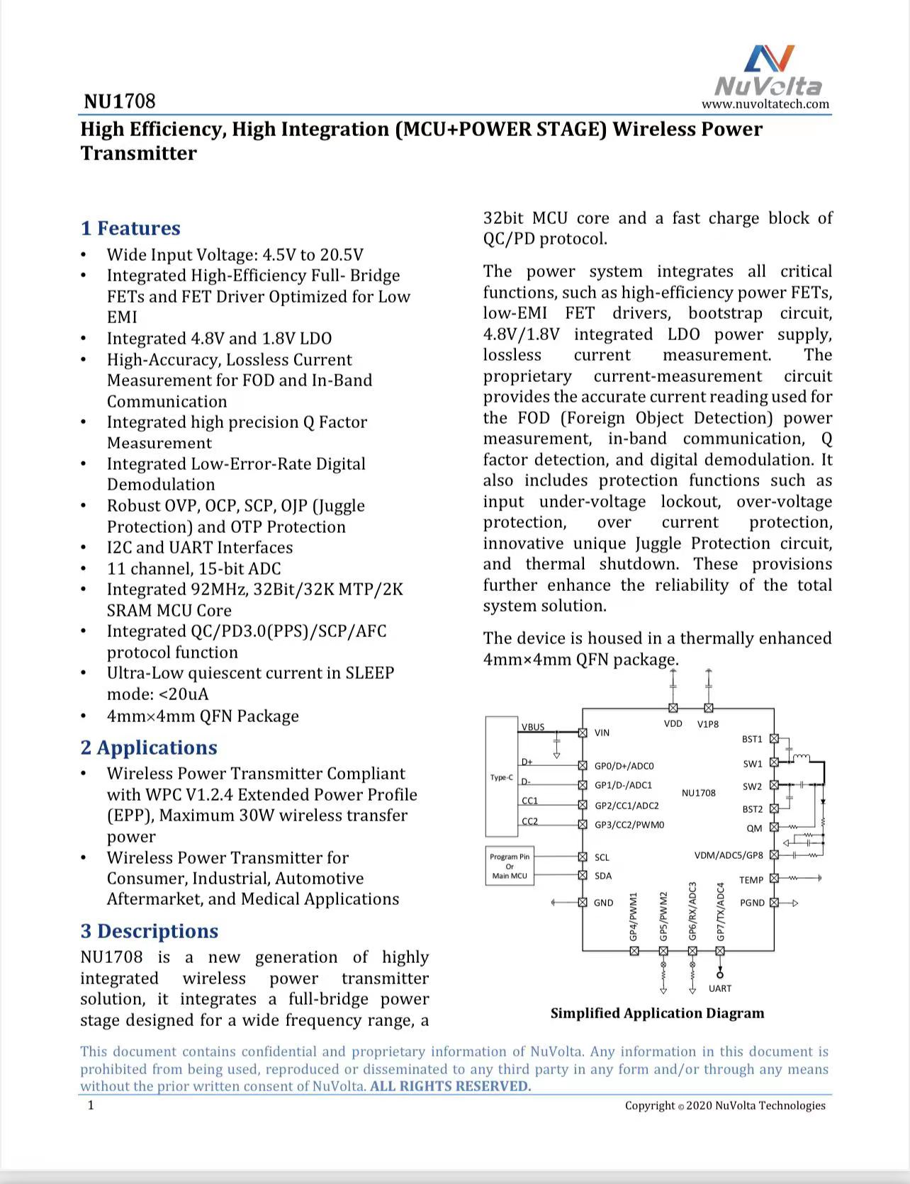 NU1705A是一款新一代高度集成的无线电力发射器解决方案,集成了为宽频率范围设计的全桥功率级、32位MCU核心和QC/PD协议的快速充电模块。