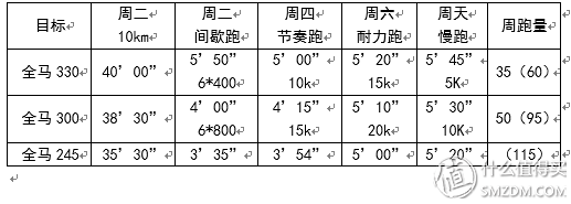 对于已经工作的的人来说,一周能抽出4天训练已是不易。跑下了全马330,我的周跑量是35KM,这是因为我有身体基础。但是对于周跑量50km,连60km都不到,这计划能否冲刺全马300,我表示很担心。表中带括号的周跑量表示理论上应达到的目标,先由少到多吧,后期再慢慢加上去。