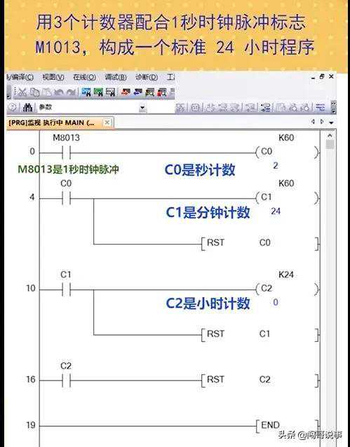 3.用3个计数器配合1秒时钟脉冲标志M8013,构成标准24小时程序