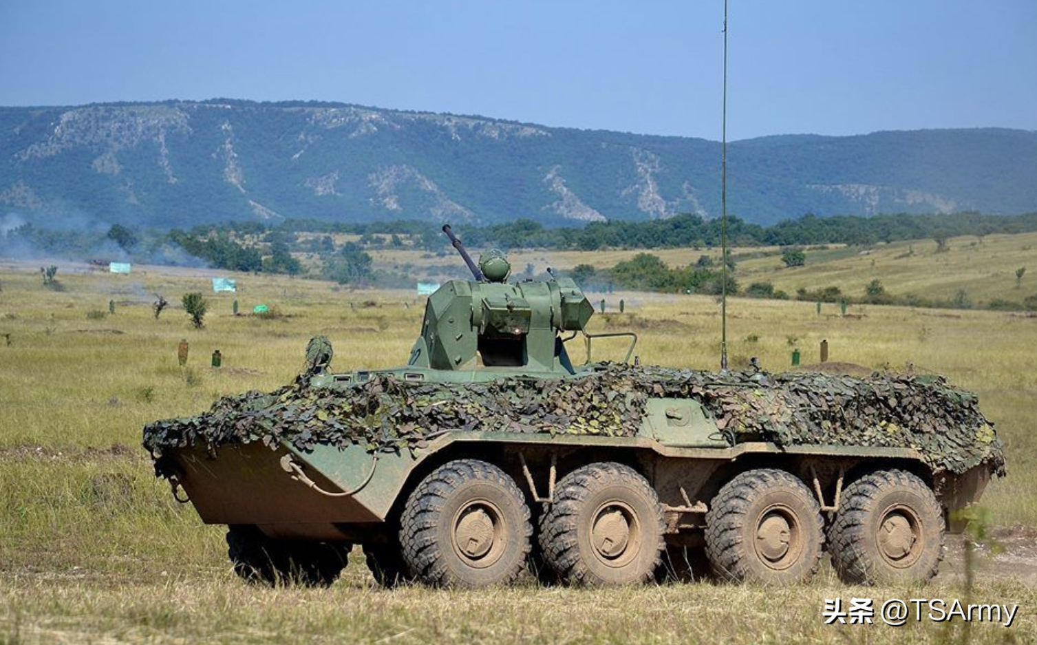 还在炮塔两侧各安装3具烟幕弹发射器,尾部还安装了一具便携式防空导弹发射器,M2010系列还分为8X8版本和6X6版本。