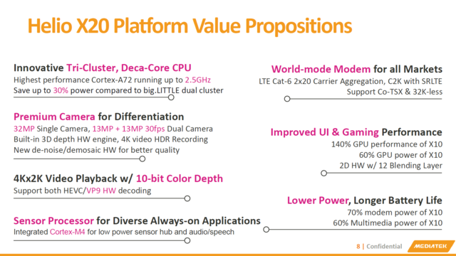 同时,这也是联发科首款片上集成了支持CDMA2000基带芯片的处理器,对于打入欧美市场有很大帮助;此外HelioX25还能够支持标准以及20+20MHz载波聚合功能,具备300Mbps的理论下载速率,与此同时HelioX25的基带芯片功耗还将比HelioX10下降30%。
