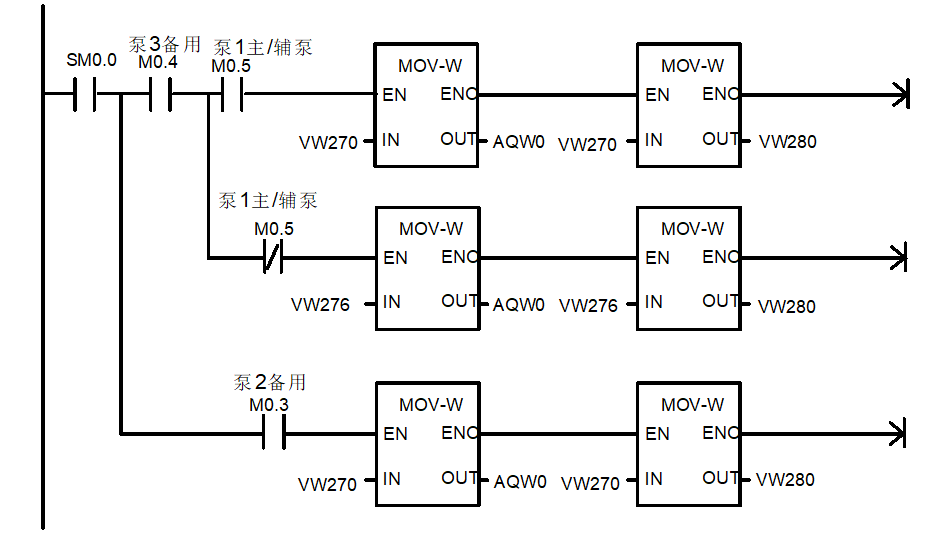 以1变频器主泵/辅泵频率给定方式的转换,=0为主泵频率给定方式,VW276通过图3进行频率的编程处理,产生频率模拟信号AQW0给变频器1;=1为辅泵频率给定方式,VW270通过图4进行手动和自动的PID运算,来完成变频器的频率AQW0给定。