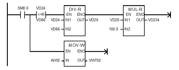 PID外部参数的设定经SIMATIC数学运算、传送指令(如图5、图6)求得。其中:VD24为设定出口水压力地址;VD66为出口水压力上限地址;AIW2为实际出口水压力地址;VW220为设定频率值地址。