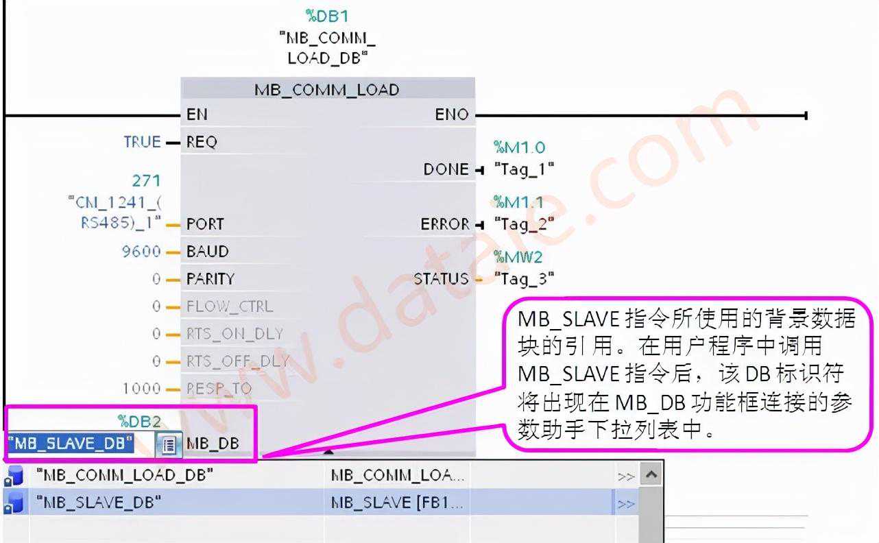 对MB_MASTER或MB_SLAVE指令所使用的背景数据块。