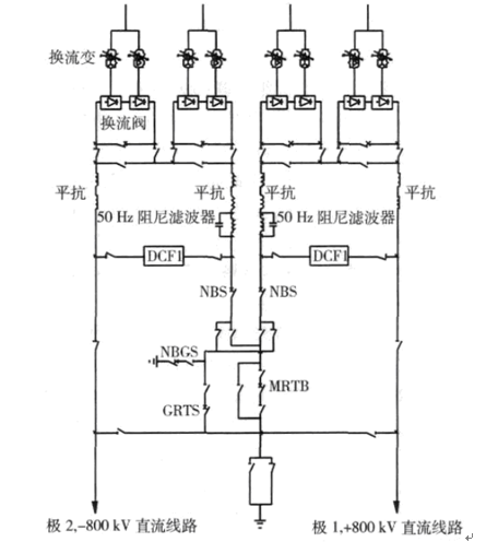平波电抗器采用2台串连的型式,分别配置在直流极线和中性线母线上,降低了平波电抗器的制造难度。每一个12脉动换流器两端并接有旁路断路器以及隔离开关,用于旁路或者投入此12脉动换流器。换流变压器的型式为单相双绕组。