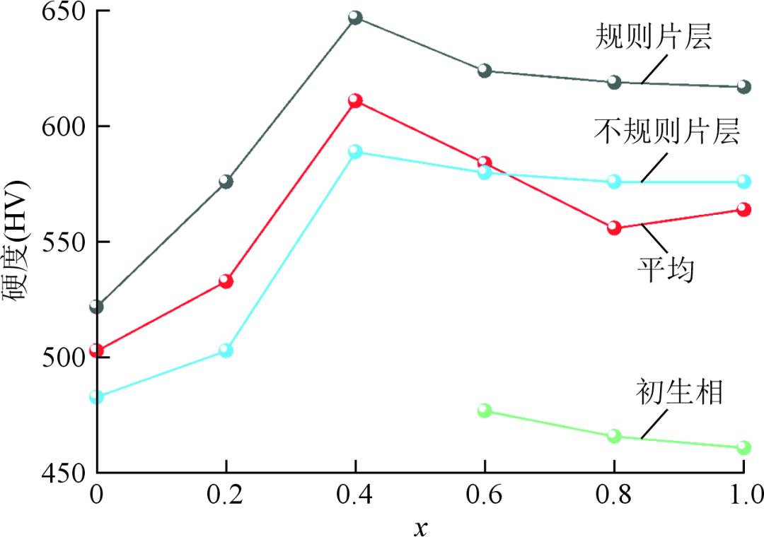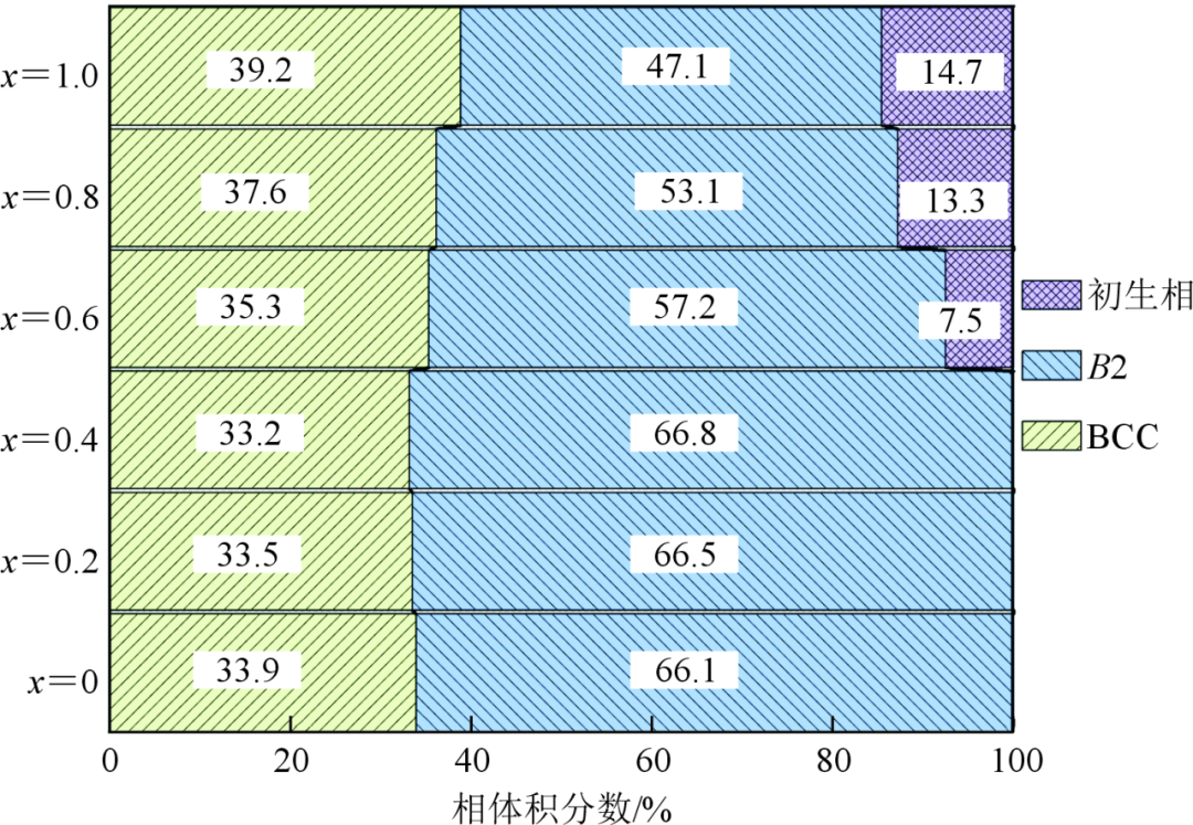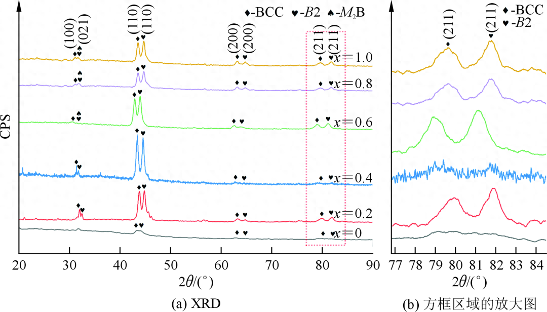 (2)随着B的加入,(NiAl)63-xV20Cr17Bx(x=0、0.2、0.4、0.6、0.8和1.0)合金中规则片层分解,不规则片层细化,当时,形成大块初生相,同时纳米沉淀物(含M2B化合物)在初生相上析出。BCC相的体积分数由33.9%增加至39.2%,B2相的体积分数由66.1%减少至47.1%,初生相的体积分数由7.5%增加至14.7%。