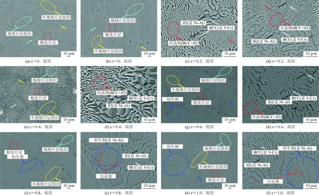 由于NiAl-34Cr和NiAl-39V为共晶组织结构,并且V-Cr二元相图表明两者可以无限固溶,因此可以设计用V、Cr无限固溶的BCC相替代Cr或V固溶体,形成B2+BCC两相共晶组织,YEXC等发现这一设计方案具有可行性,(NiAl)63V20Cr17的微观结构为规则的共晶组织。
