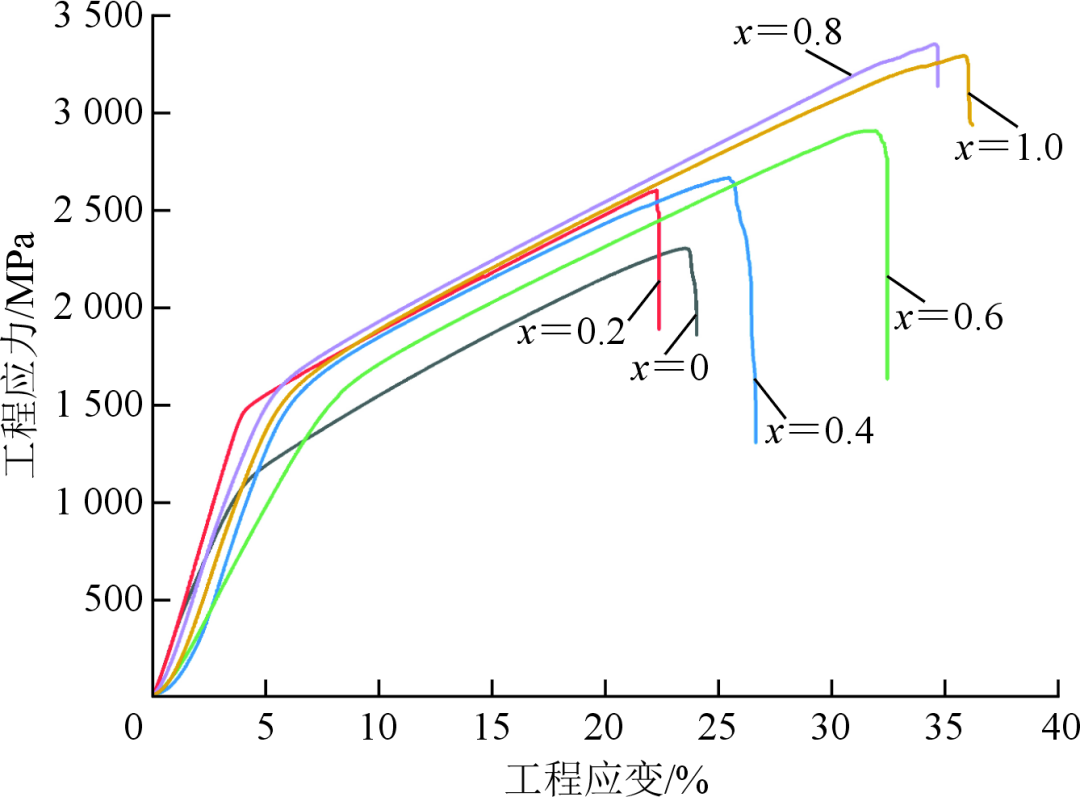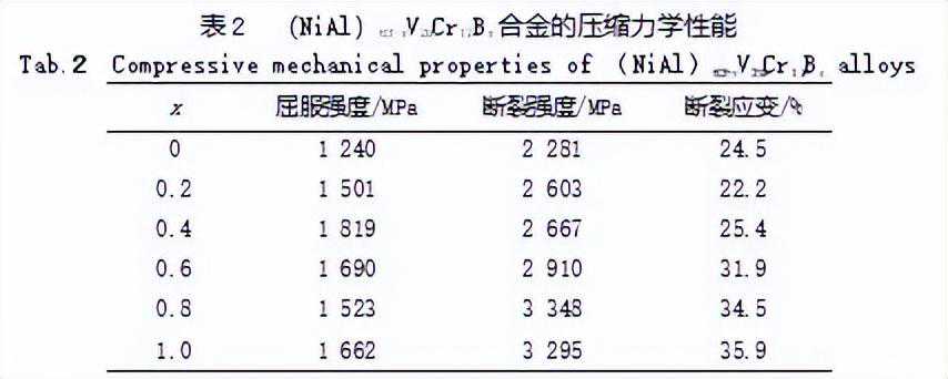 图7(NiAl)63-xV20Cr17Bx合金压缩工程应变-应力曲线