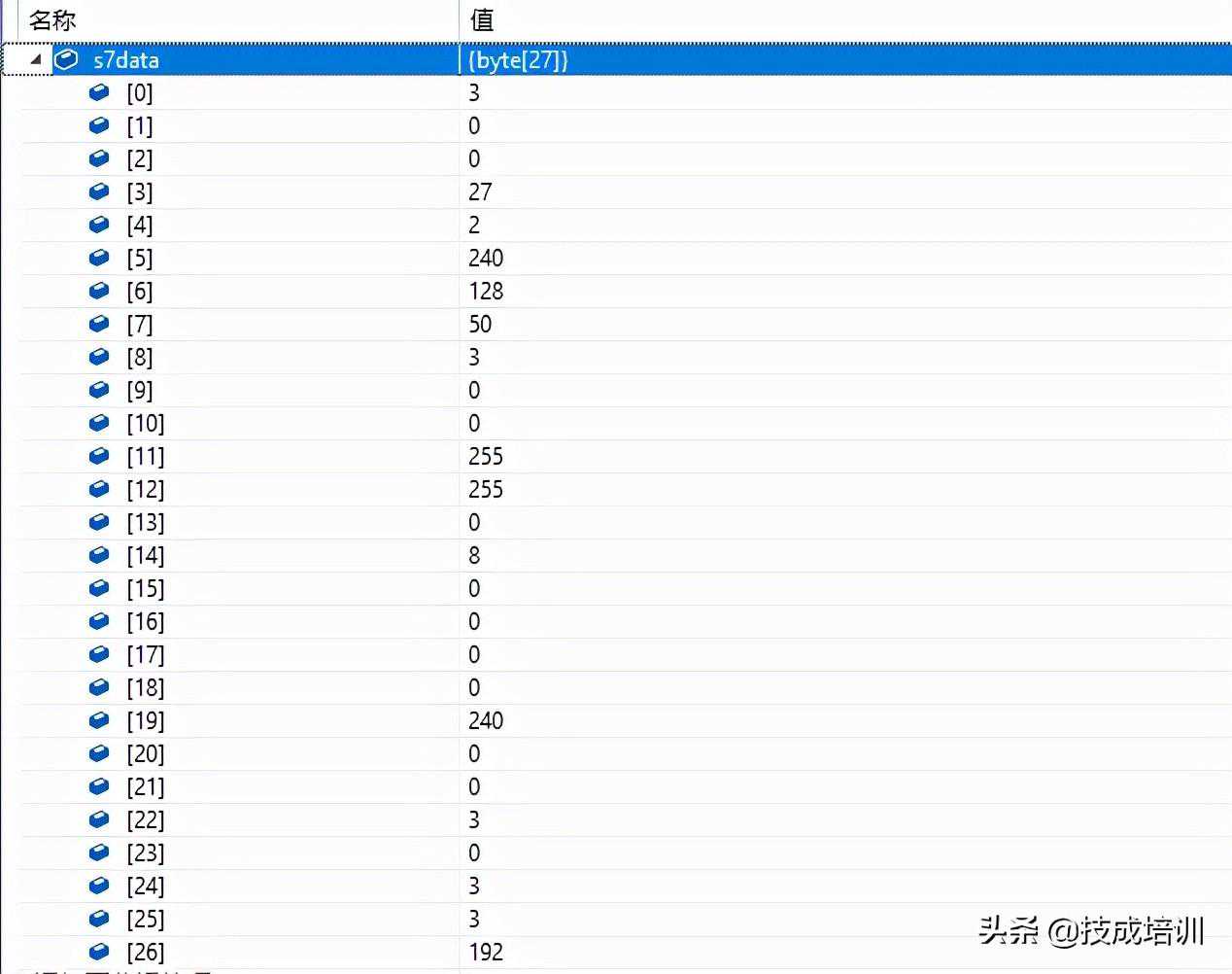 第二次握手返回的报文长度是27个字节,最后两个字节就是PDU的值,上图展示的是S7-1200PLC返回的报文,0和240的组合即为240。
