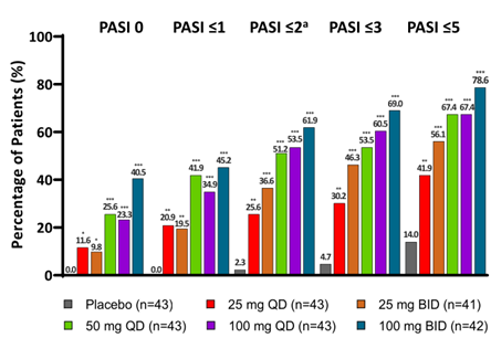 25mgBID组PASI=0(),PASI≤1(),PASI≤2/PASI≤3/PASI≤5的P均0.001;