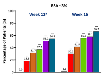 与安慰剂组相比,每个JNJ-77242113治疗组在第12周达到BSA≤3%和≤1%的患者比例明显更高。从第12周到第16周,所有JNJ-77242113治疗组患者的应答率均有所增加(图3)。