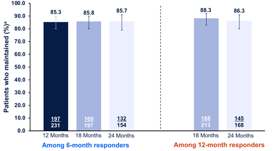 图3在第6或12个月达到PASI90的患者中,连续使用RZB治疗12、18和/或24个月时维持PASI90应答