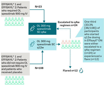 EffisayilON结果:患者接受佩索利单抗每12周皮下注射300mg和每4周皮下注射300mg强化治疗,结果进一步表明每4周皮下注射300mg预防GPP发作疗效更好。