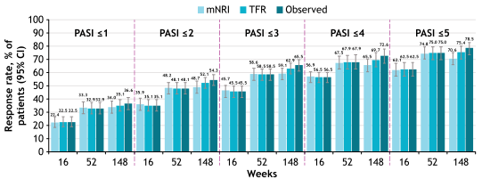 此外,绝对PASI阈值从第16周到第52周,应答率增加或总体保持不变(图3)。应答率从第52周持续到第148周;第148周与第52周相比,PASI3至≤5内的应答率稍低,可能是由于第148周时转向更高的分数(PASI≤3)(图4)。无论是使用观察值还是使用mNRI和TFR数据估算方法,达到PASI阈值和PASI范围的患者比例都相似。