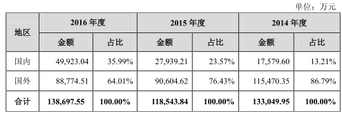 2013年至2016年,公司国外销售收入98,331.15万元、115,470.35万元、90,604.62万元、88,774.51万元,占主营业务收入的比重分别为89.90%、86.79%、76.43%、64.01%。此外,产品外销,主要销售国的市场环境变化、汇率变动、贸易政策壁垒等因素可能对公司业务收入产生重大影响。