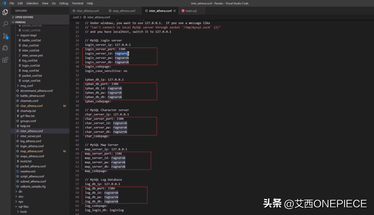 到这里我们数据库暂时就告一段落了,现在我们打开Pandas服务端用VS程序打开找到inter_文件打开看一下mysql的loginserver的密码账户DB是不是我们设置的数据库账户密码,如果你不想用这个账户密码记得到这个文件自己去修改