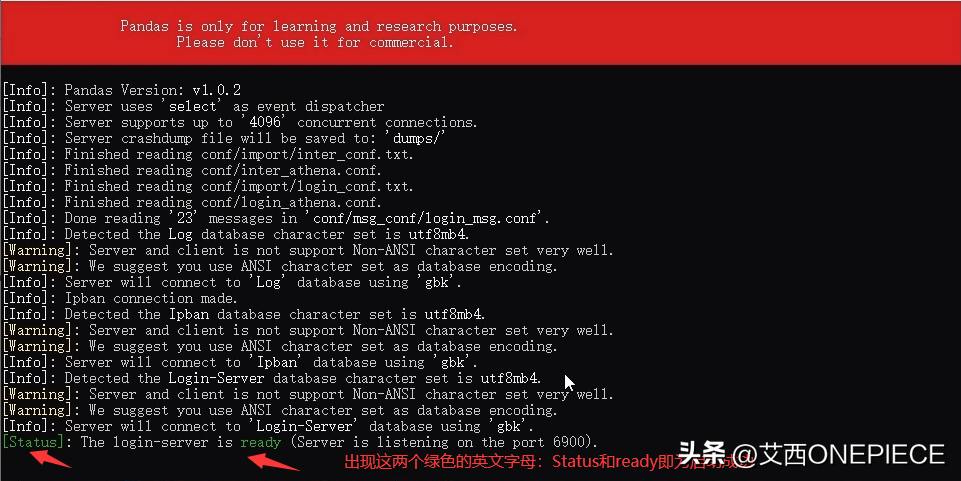 现在我们启动Pandas服务器双击,出现这两个绿色的英文字母:Status和ready即为启动成功