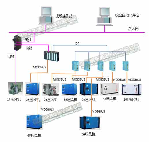 系统基于工业以太环网,底层控制采用西门子系列PLC,组态画面使用为控制核心,实现选煤厂10台压风机控制,配套风包温度、压力采集,风包定时排污、水冷系统自动控制以及余热利用的接入。