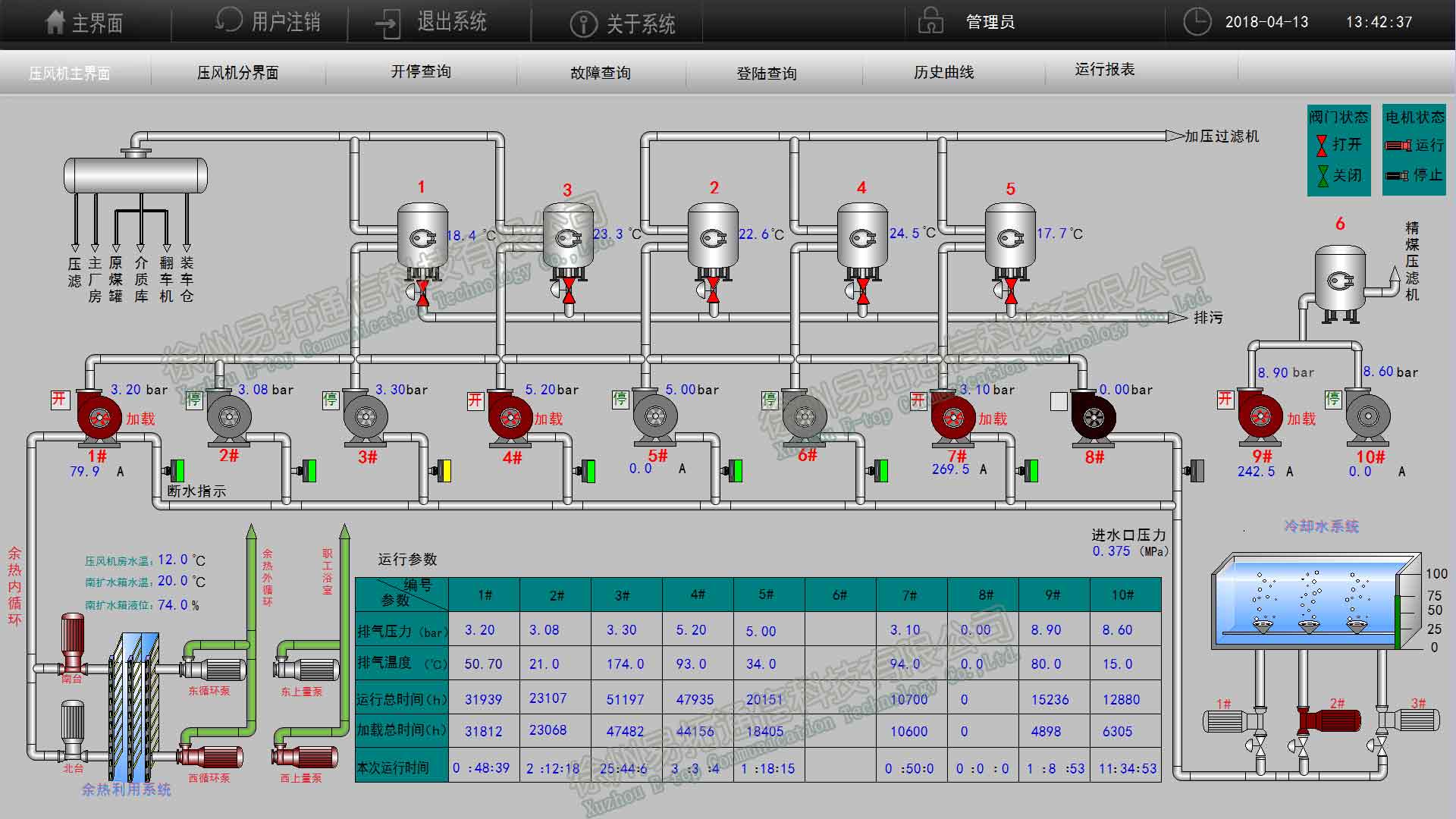 选煤厂10台压风机,控制方式为现场操作。其中有8台为水冷方式,2台为风冷,2趟冷却水管,通过三台水泵主备检模式实现冷却水循环(现场采用西门子200PLC控制),同时具备余热利用系统。