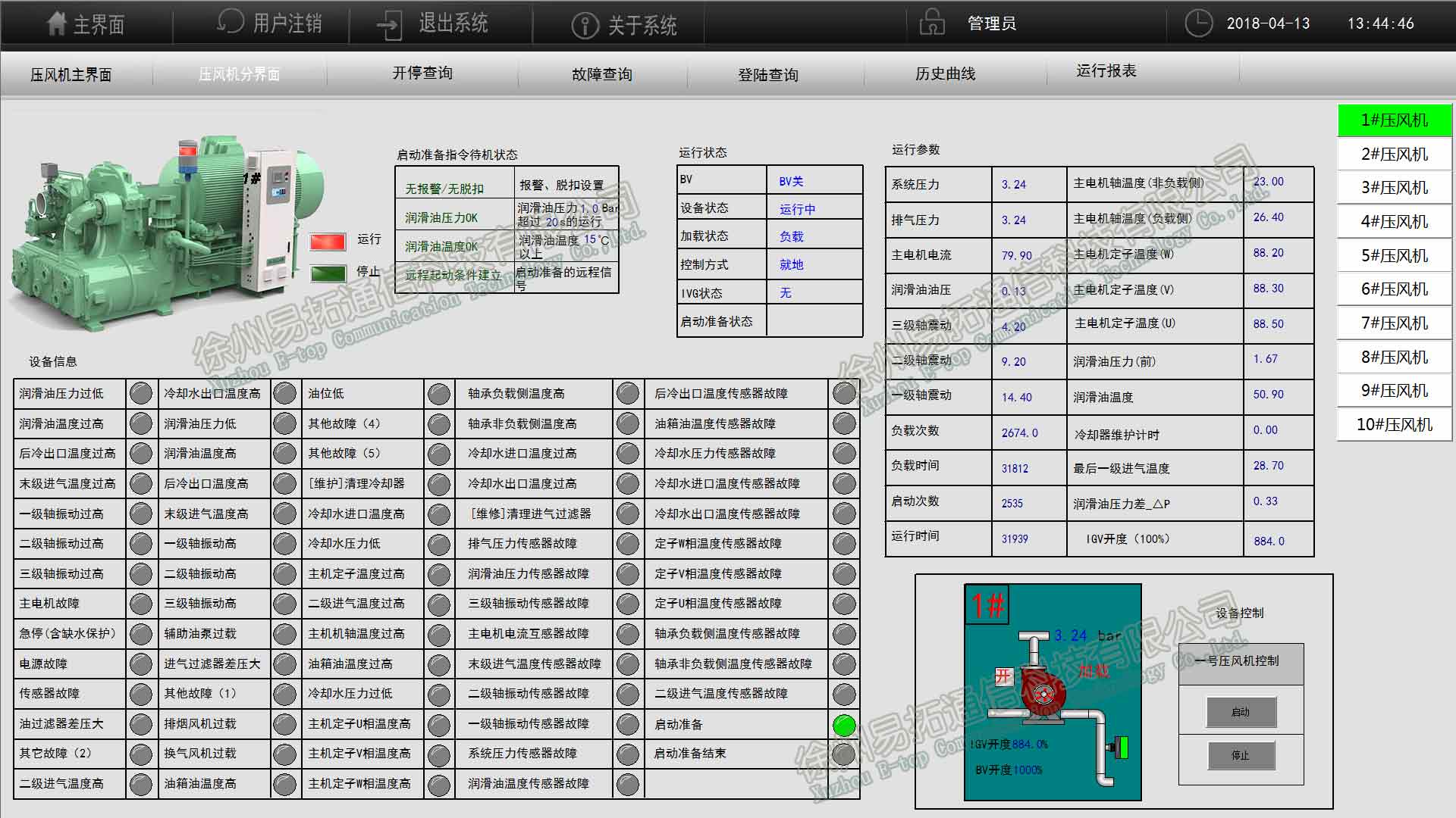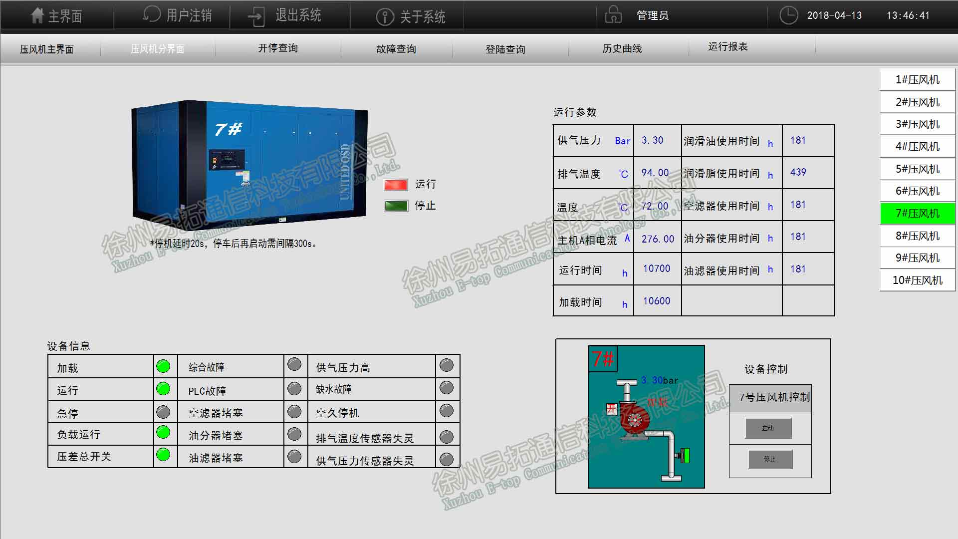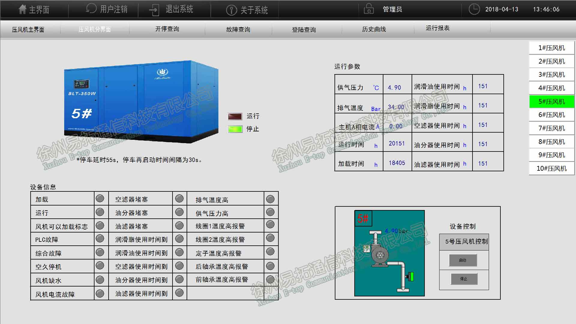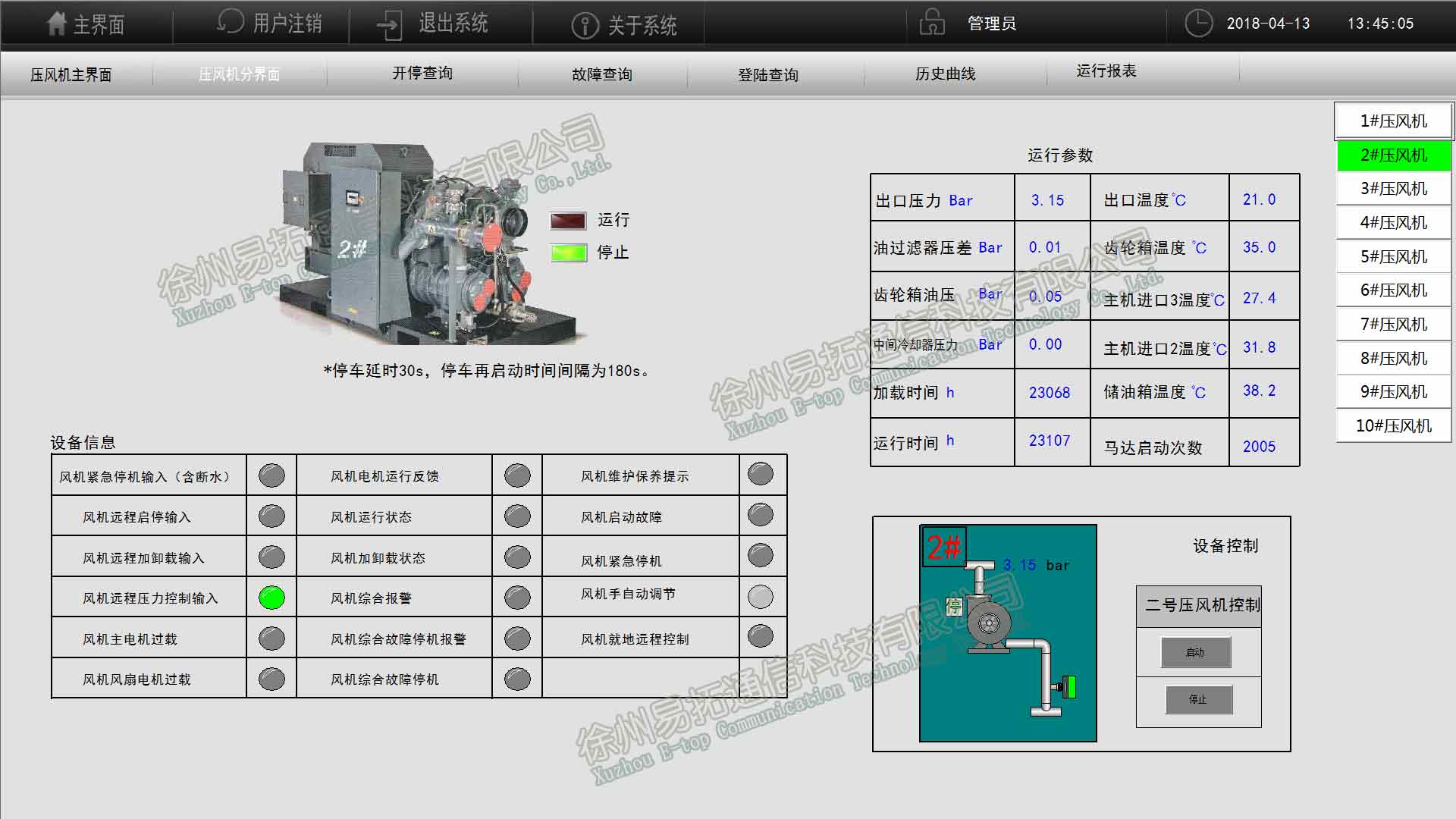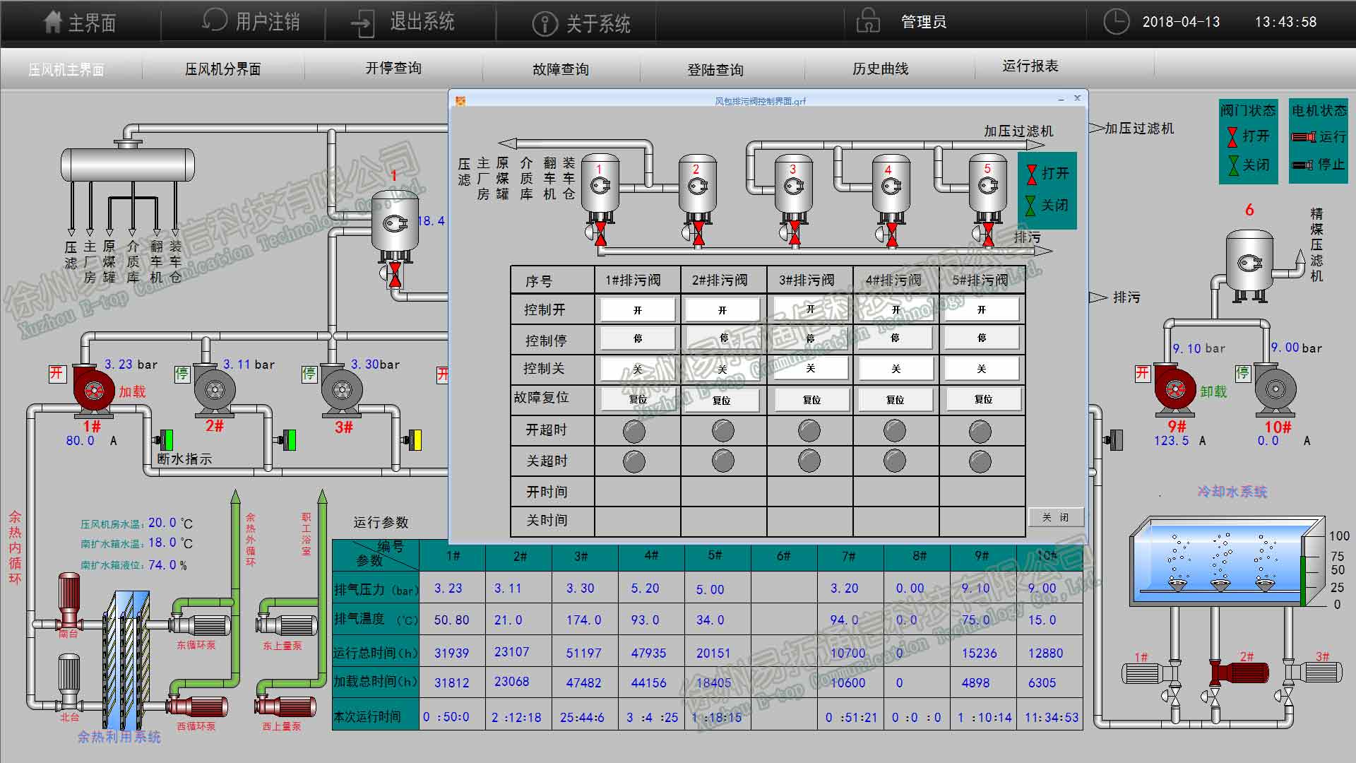 远程控制方式:在该模式下,通过上位计算机的操作来在控制各压风机系统的运行。系统对操作员有权限管理,有一定的权限的操作员才可以进行远程操作。