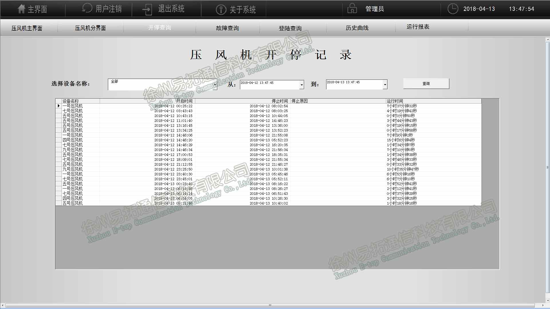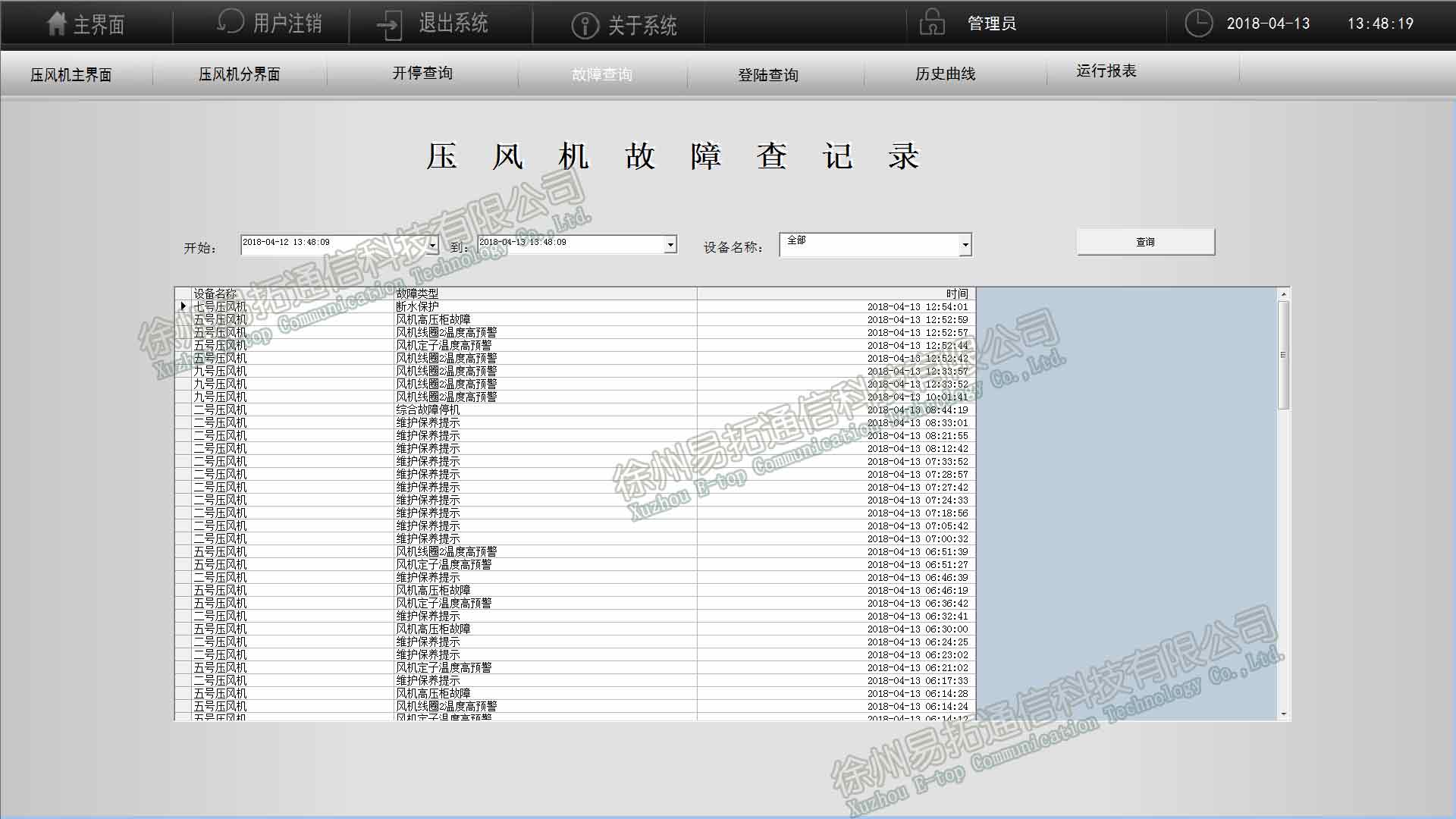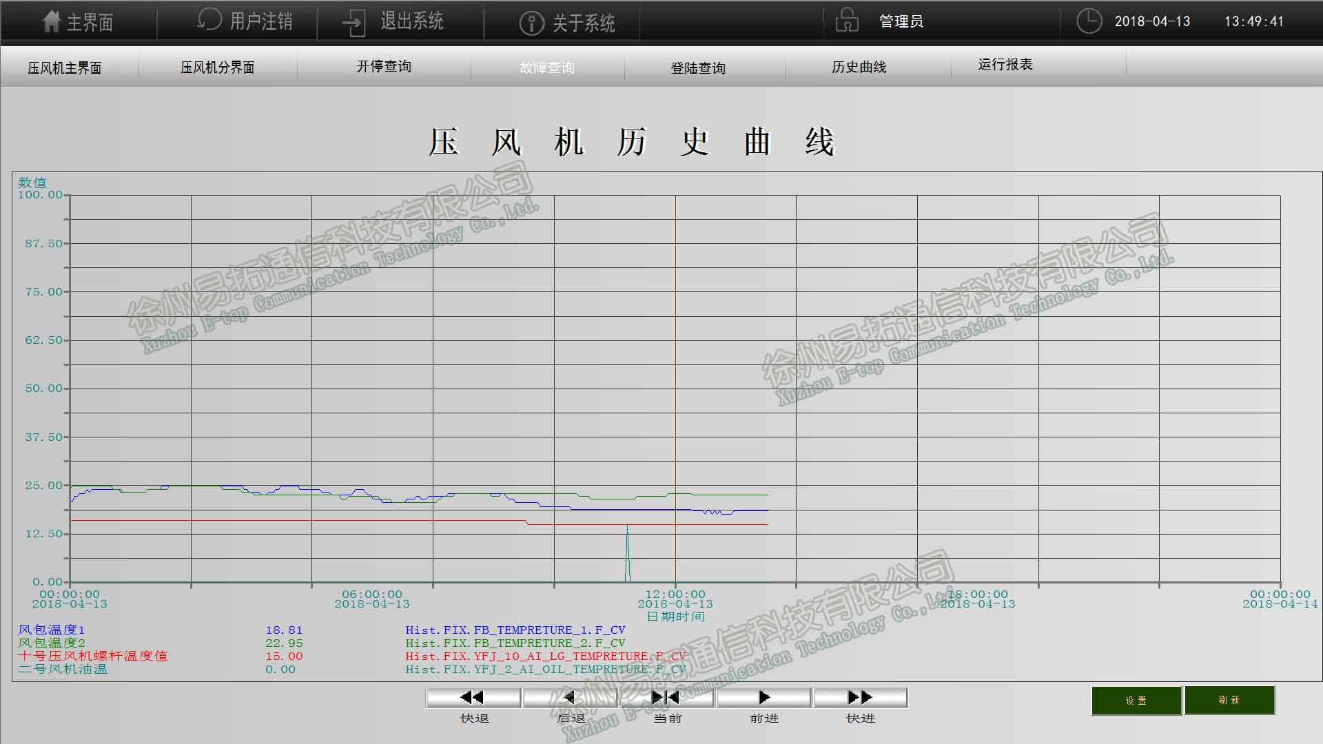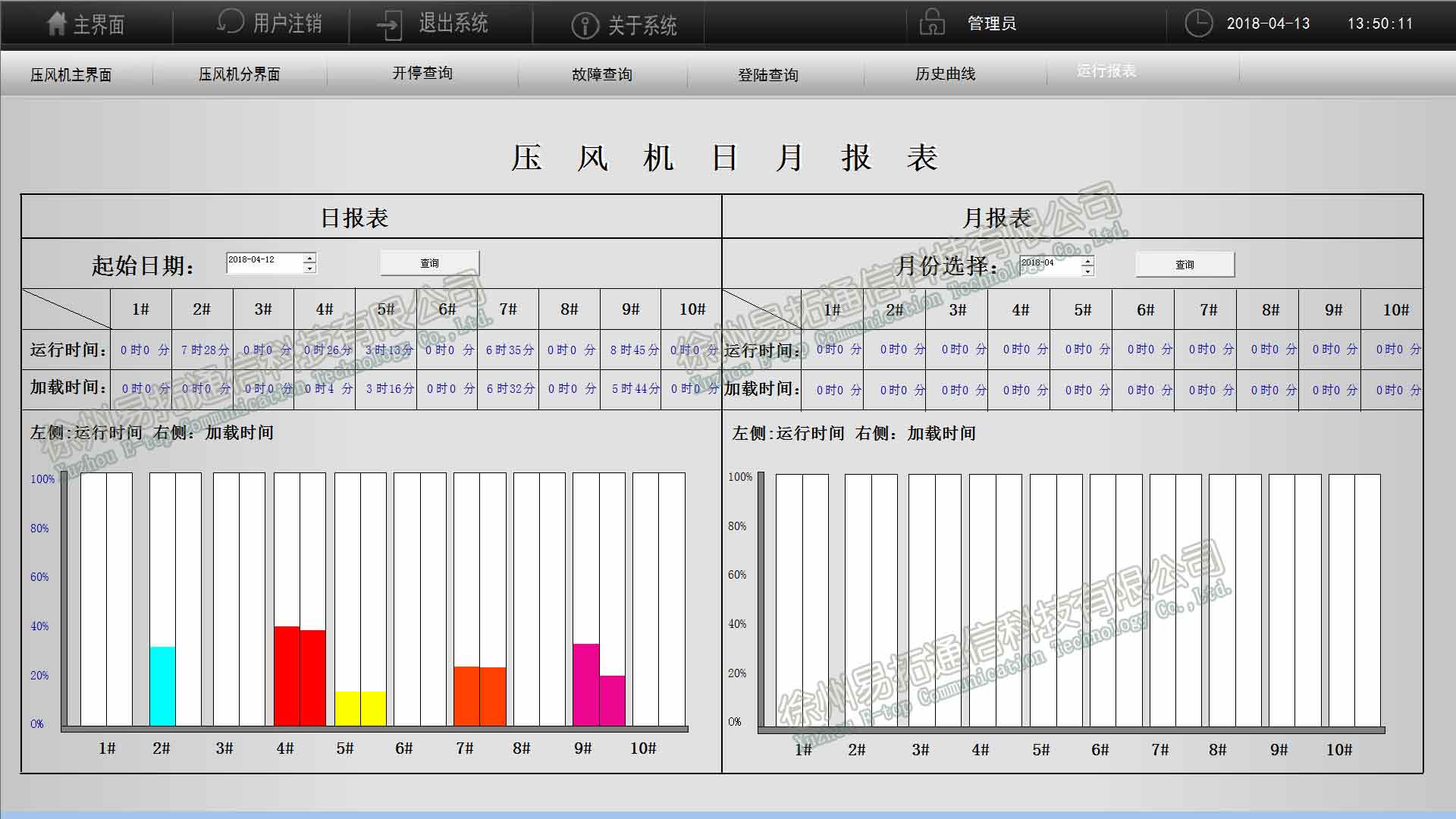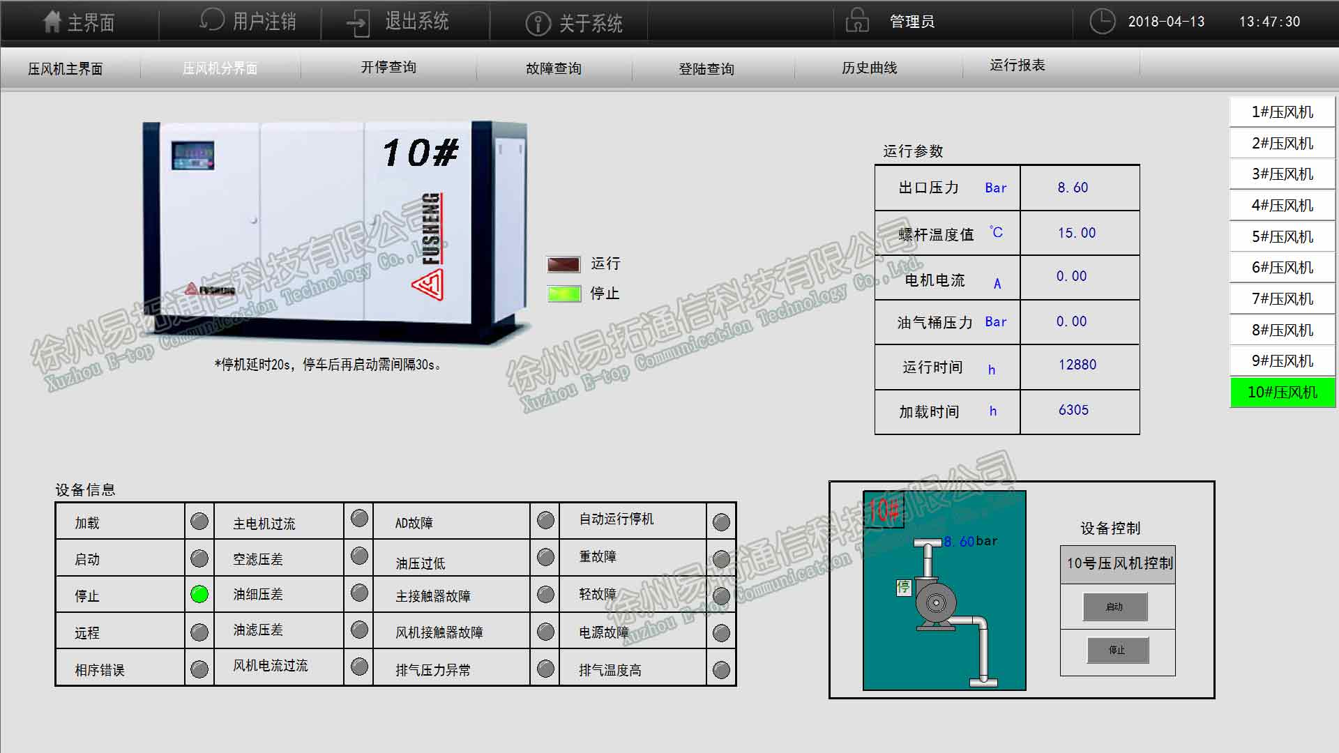 远程控制方式:在该模式下,通过上位计算机的操作来在控制各压风机系统的运行。系统对操作员有权限管理,有一定的权限的操作员才可以进行远程操作。
