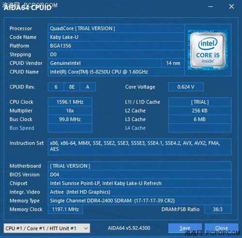 从AIDA64CPUID可以看到蜂鸟C24-710S一体机搭载的酷睿i5-8250U处理器,基于14nm制程,采用四核设计,默认主频为1.60GHz。