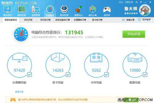 最后再来一次综合跑分,通过鲁大师的整体跑分情况来看,这款宏碁蜂鸟C24-710S一体机总分为131945,处理器性能跑分97420,显卡性能跑分14263,内存性能跑分9282,磁盘性能跑分10980。