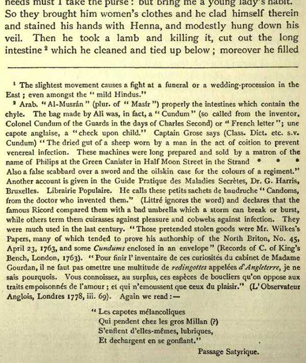 下文涉及伯顿译本里的具体内容,就更加荒谬了。有一句“关于他那慢腾腾的乐趣,第七卷目录里滑稽地题为《忧伤的披风》的注释就是个很好的例子”。前半句,原文是Delasdelectacionesmorosasenqueparó,就是说伯顿文风拖沓。“题为《忧伤的披风》的注释”,指的是伯顿译本第七卷有个脚注,第一行有“Lescapotesmélancoliques”一语,这个脚注为解释原文里出现的阿拉伯人用羊肠造的小袋子而作,要是读者诸君还没看懂,我不妨在此明说:“忧伤的披风”指的就是避孕套而已(此“披风”就类如张德彝在一百多年前翻译的“法国衣”之“衣”)。又如“关于拜尔基思女王腿上毛细现象的传说”,难道说女王的腿还能在沙漠里吸水不成?原文这里是capilaridal,不谓“毛细”,反言其毛发浓密了。我们想起西班牙语界一向不相信女人“胸上生毛”的,因此这里腿毛也都要改细了才好。接下来,博尔赫斯要炫耀他从伯顿译本摘来的生僻别致的字词了,我发现其中有两个是明显翻译错误了的。一个是ingloria,中译者依据字典的一般解释,在括弧里加上了他的译文:“以主的荣耀。”可我们去查伯顿原书,在第694夜出现过,伯顿说,这是意大利俚语,指的就是性高潮。另一个languefourreé,同样附有非常老实的译法:语缀。假如这么简单,博尔赫斯又如何能算是博尔赫斯呢?我们还是去找伯顿译本是怎么说的吧。那段原文是这么一句: