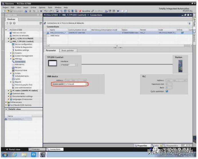 3.检查HMI站中通讯(Connections)的设置,连接名必须为S7ONLINEa)HMI站与S7-300/400站的通讯设置